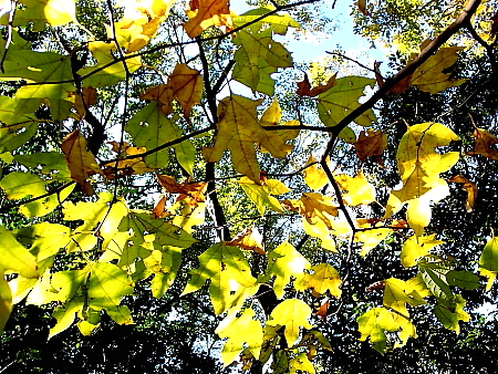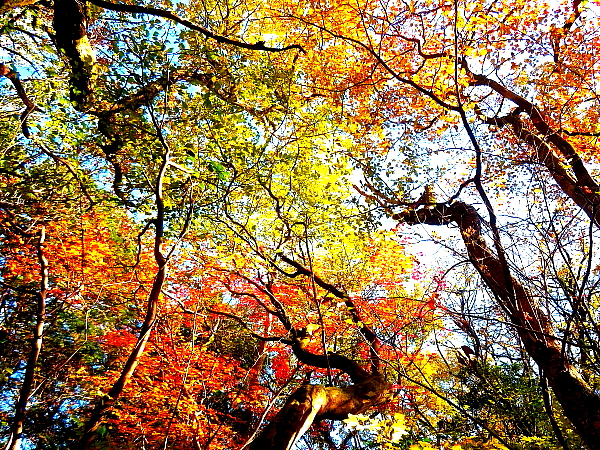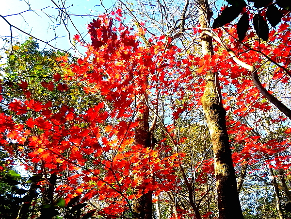 2024年12月1日 佐賀と福岡の県境にある七曲り峠から、山頂へ向かう。登山道を進んでいると、白い花びらが地面に落ちている。見上げれば、高いところに自生種のサザンカの花が幾つも咲いている。さらに進むと、今度は赤い花が落ちている。同じように見上げながら探す。すると、高い葉陰に咲くヤブツバキの花を見つけた。ヤブツバキの花を見るのは、今季初めてである。^^♪ 登山道には時折紅葉も現れる。青空に映える赤や黄色は美しく、それらを拾うように撮りながら登る。山頂は樹林の中で展望は得られず、一休みして往路を引き返した。 |