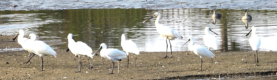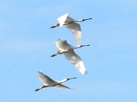 2024年12月2日 三週間ぶりに花立山を歩いてみた。登山口の公園は樹木が赤や黄色に染まって鮮やかだ。野道にはスミレやオドリコソウ、それにホトケノザなどが咲いている。山裾ではアリドオシやマンリョウの実が赤く熟れ、前回は閉じていたマユミの実が開いて、真っ赤な種子がのぞいている。山頂は見晴らしが良く、麦まきが進む筑紫平野が広がっていた。 今日は登山の前に、冬鳥が見られる溜め池に立ち寄ってみた。水が減った池には、たくさんのカモやクロツラヘラサギが見える。しばらくするとクロツラヘラサギが一斉に飛び立ち、その様子を初めてカメラに収めることができた。^^ |