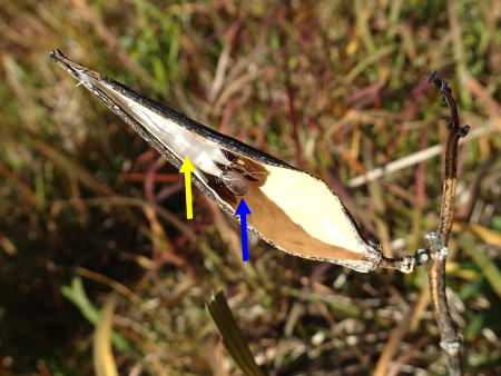 ![]() 莢が割れて中の種子と白い種髪が見える 種髪が開いて風に乗る前 青の矢印は種子 黄色の矢印は種髪 このすぐ後、風に運ばれて行った フナバラソウ実 |