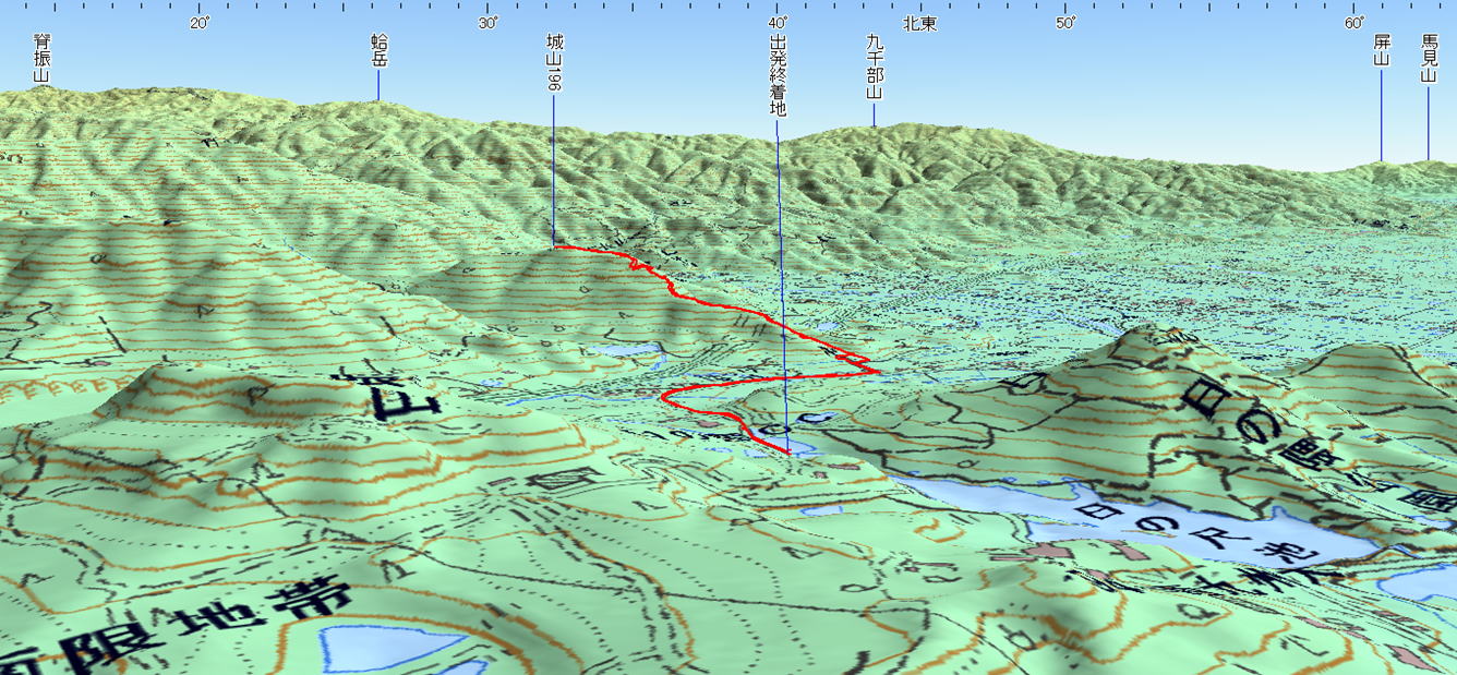 3D 設定:対地高度250m レンズ16mm 日本山名データ25000+追加地名 経路断面概念図 GPS(軌跡+標高データ) 断面の沿面距離約3.5km 所要時間1:50