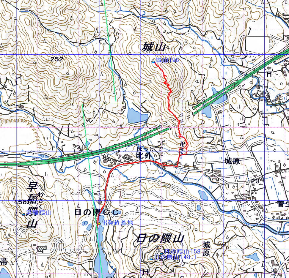 城山 佐賀県 25.3.30) 経路概念図 GPS軌跡 1/12000地形図 緯線の間隔10秒、距離約310m 経線の間隔10秒、距離約250m 緑の直線は磁北線