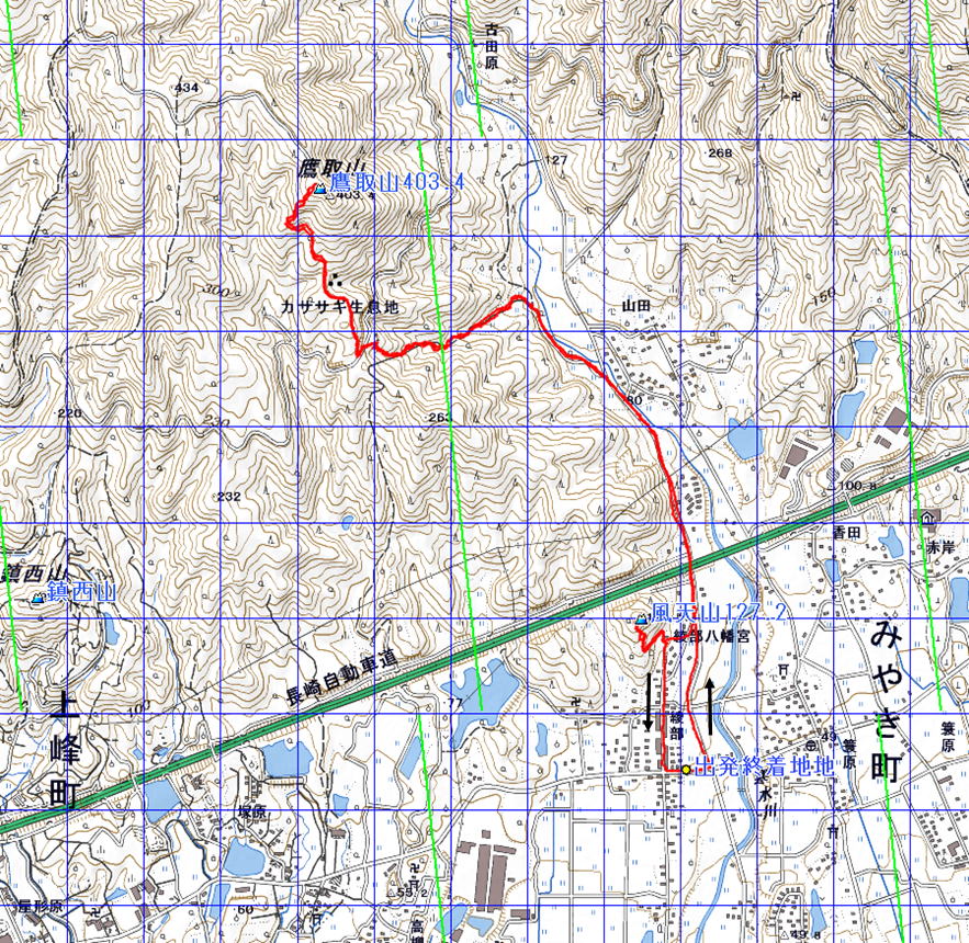 鷹取山 (佐賀県 25.04.04) 経路概念図 GPS軌跡 1/25000地形図 緯線の間隔10秒、距離約310m 経線の間隔10秒、距離約250m 緑の直線は磁北線 注:終着地は綾部バス停