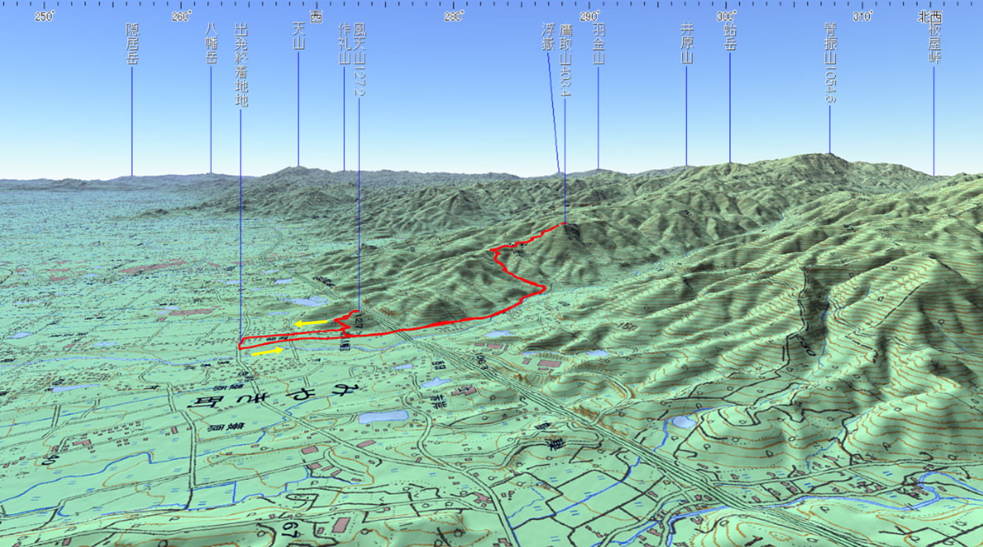 3D 設定:対地高度700m レンズ16mm 日本山名データ25000+追加地名 経路断面概念図 GPSデータ+10mメッシュ標高データ 断面の沿面距離約7.4km 所要時間3:50