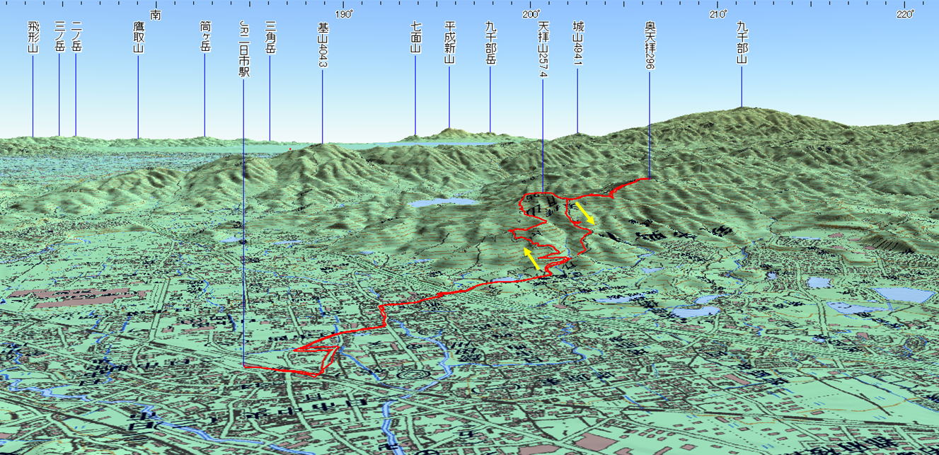 3D 設定:対地高度450m レンズ16mm 日本山名データ25000+追加地名 経路断面概念図 GPSデータ+10mメッシュ標高データ 断面の沿面距離約7.1km 所要時間3:00