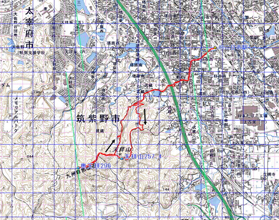 天拝山 奥天拝 (福岡県 25.4.8) 経路概念図 GPS軌跡 1/25000地形図 緯線の間隔10秒、距離約310m 経線の間隔10秒、距離約250m 緑の直線は磁北線