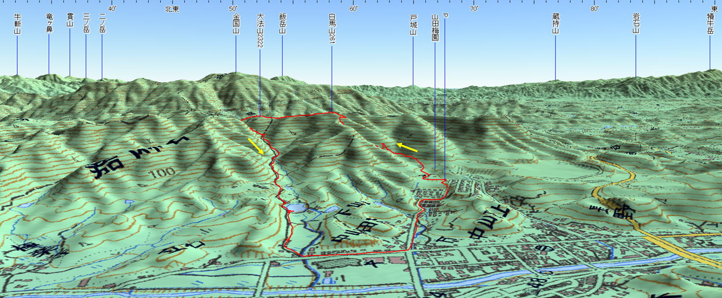 3D 設定:対地高度270m レンズ16mm 日本山名データ25000+追加地名 経路断面概念図 GPSデータ+10mメッシュ標高データ 断面の沿面距離約3.9km 所要時間2:00