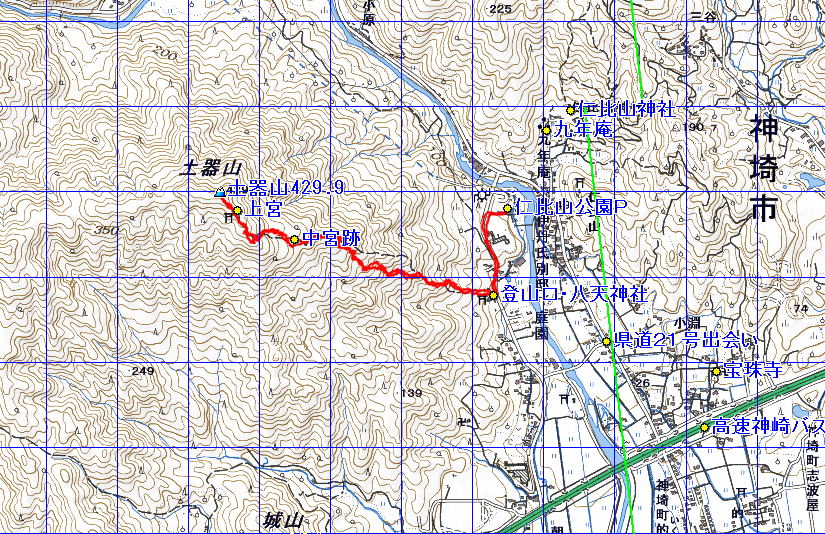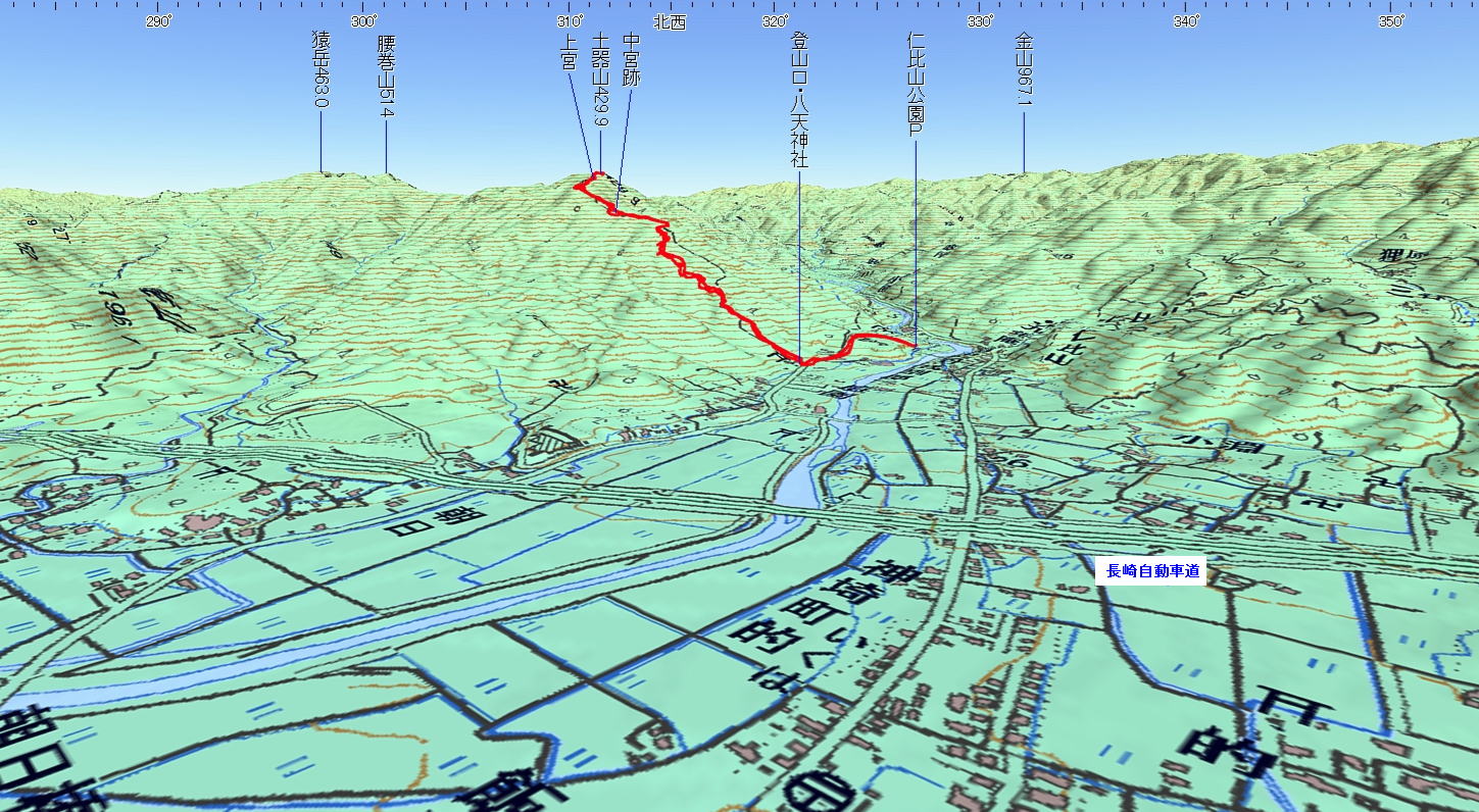 土器山 (佐賀県 25.08.16) 経路概念図 GPS軌跡 1/25000地形図 緯線の間隔10秒、距離約310m 経線の間隔10秒、距離約250m 緑の線は磁北線 注:出発終着地は、仁比山公園P 3D 設定:対地高度290m レンズ16mm 日本山名データ25000+追加地名 経路断面概念図 GPSデータ+10mメッシュ標高データ 断面の沿面距離約4.0km 所要時間3:45