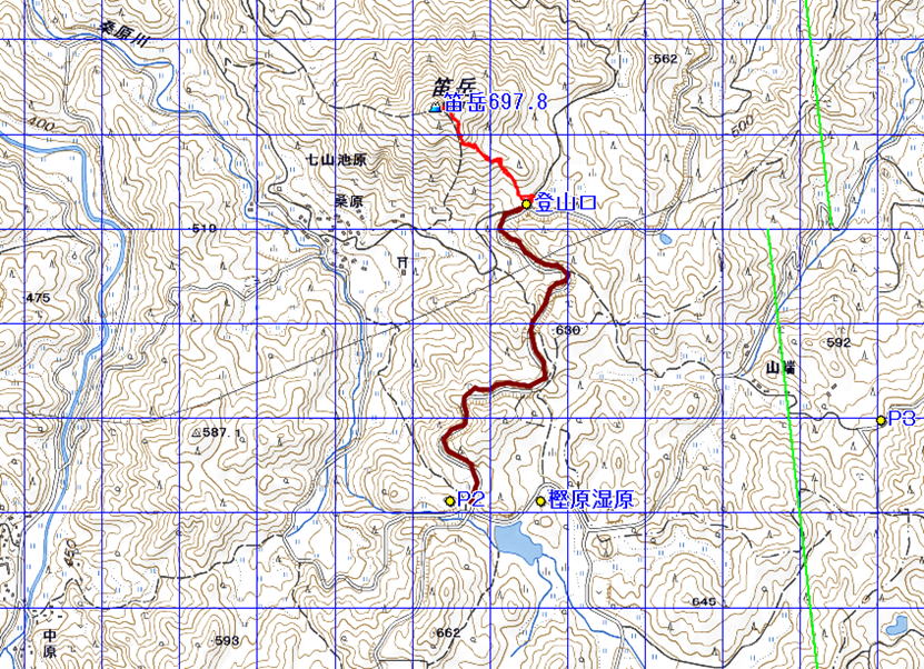 笛岳 (佐賀県 2025.9.3) 経路概念図 GPS軌跡 1/25000地形図 緯線の間隔10秒、距離約310m 経線の間隔10秒、距離約250m 緑の直線は磁北線 注:茶色の軌跡は、登山口へ通じる林道 3D 設定:対地高度830m レンズ16mm 日本山名データ25000+追加地名 経路断面概念図 GPSデータ+10mメッシュ標高データ 断面の沿面距離約1.3km 所要時間0:50