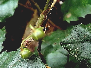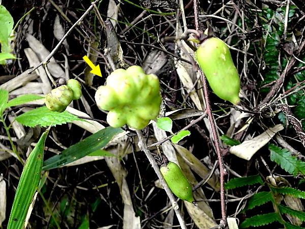 ![]() マタタビの実 右は正常果 矢印は虫癭果) |