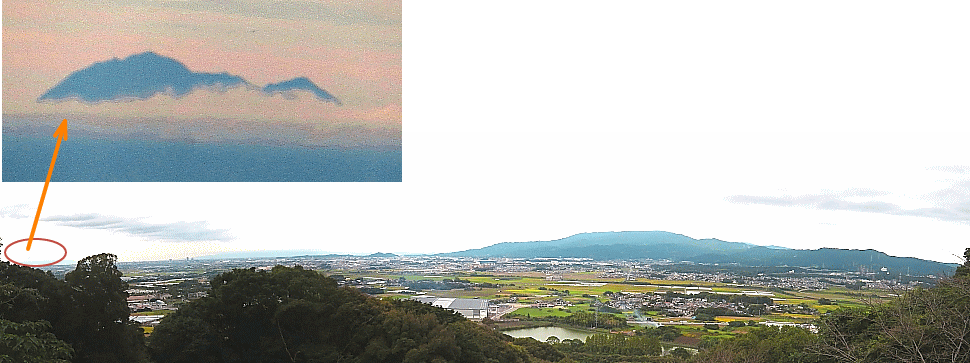 ![]() 山頂からの眺め 矢印は雲仙の平成新山 中央奥は九千部山 |