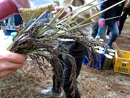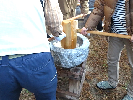 地域興しの皆さんが棚田で栽培した黒米を使って餅つき中 参加はたくさんの家族連れ |