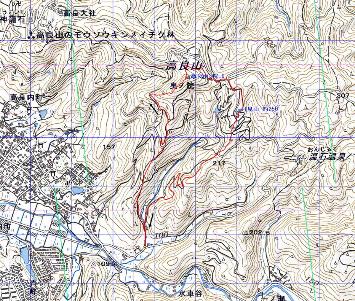 髙良山 月見山 (福岡県 25.11.28)経路概念図 GPS軌跡 1/12000地形図 緯線の間隔10秒、距離約310m 経線の間隔10秒、距離約250m 緑の直線は磁北線 注:出発終着地は後谷登山口P
