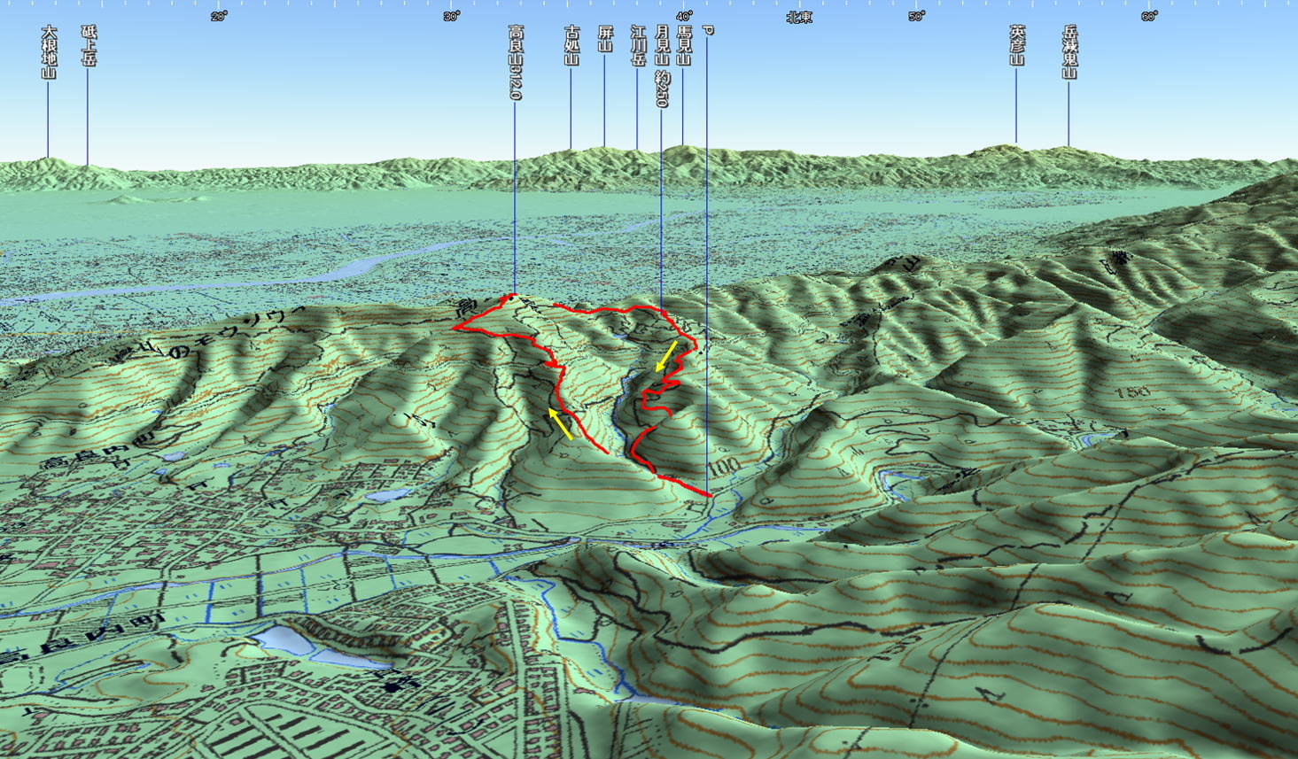 3D 設定:対地高度520m レンズ16mm 日本山名データ25000+追加地名 経路断面概念図 GPSデータ+10mメッシュ標高データ 断面の沿面距離約3.8km 所要時間2:00