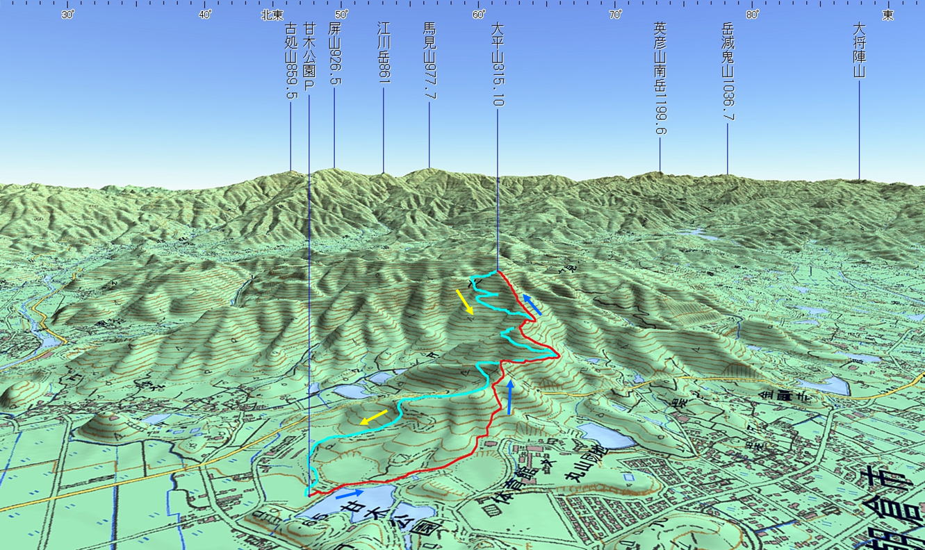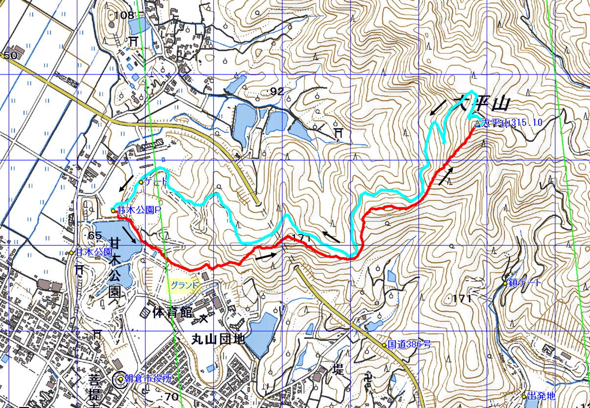 | 凡例 赤の軌跡:旧登山道(徒歩道) 水色の軌跡:一般登山道(遊歩道・林道) |