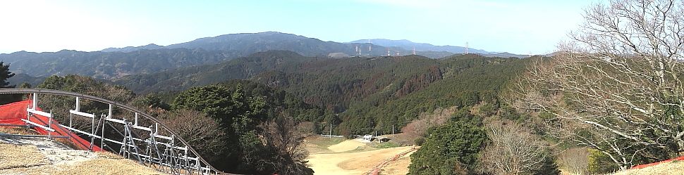 | 基山山頂からの眺め 下は草スキー場 中央奥は九千部山 右奥は脊振山 |