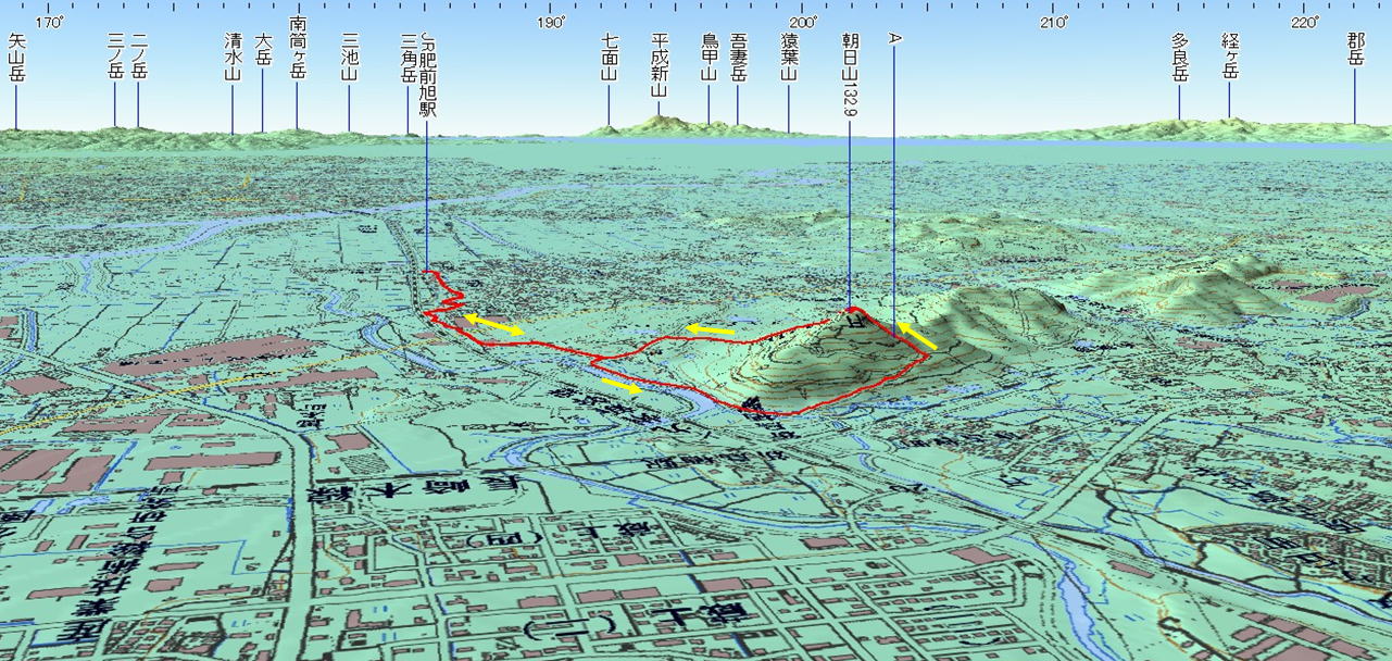 3D 設定:対地高度460m レンズ16mm 日本山名データ25000+追加地名 経路断面概念図 GPSデータ(経路+標高データ) 断面の沿面距離約6.0km 所要時間2:25