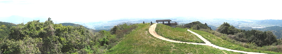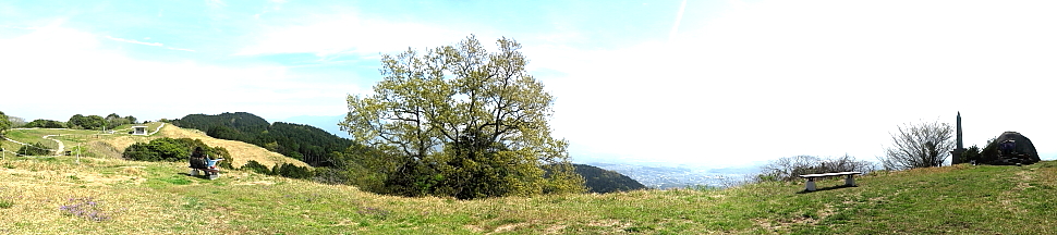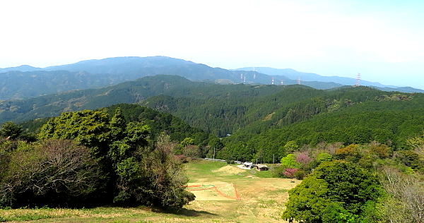基山山頂からの眺め 下は草スキー場 中央奥は九千部山 右奥は脊振山 |