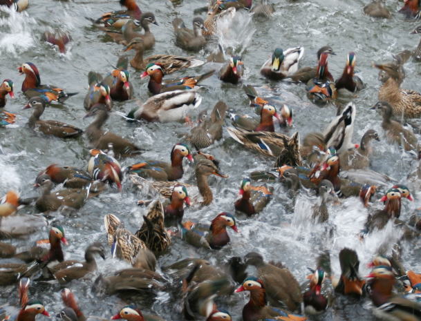 ![]() 水しぶきを上げて、一斉に川底の餌ひろい |