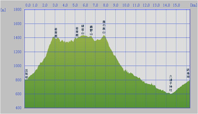 経路断面概念図 GPSデータ 断面の沿面距離約17.0km(うち、林道と県道は約7.1km) 所要時間9:14