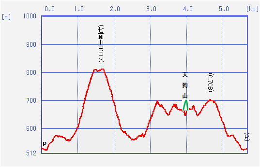 | 凡例 P:駐車広場 A:踏み跡分岐点 B:稜線出会 C:ピーク 注:茶色の線は、ネイチャーセンタへ通じる車道 |