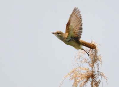 ヨシは密生していて、中にいる姿を見つけることはできないものの、緑のヨシの上に出ている枯穂に止まる姿を捉えることができた。