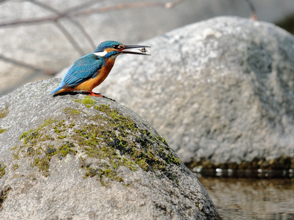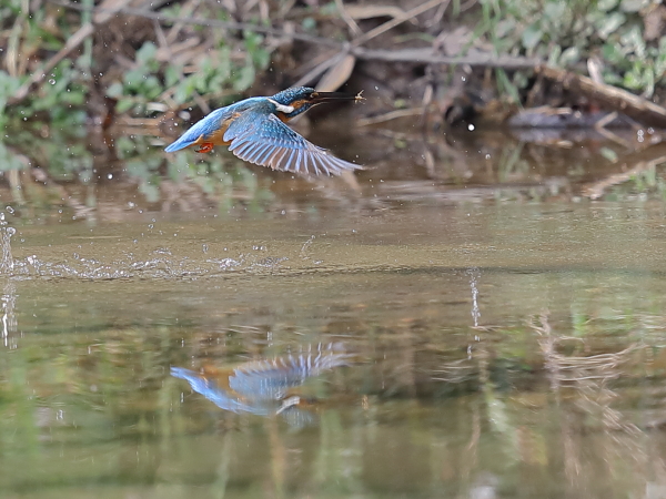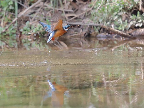 カワセミが捕った餌は、今回もカワゲラの幼虫。彼は餌捕りがうまいようで、失敗はゼロ。と、いうのも獲物は動きの鈍い幼虫だから