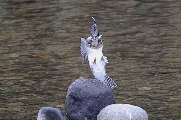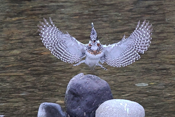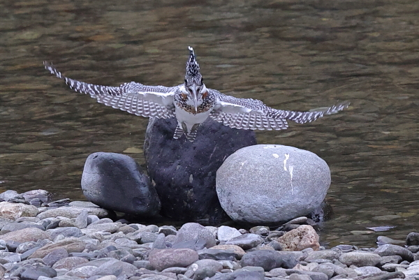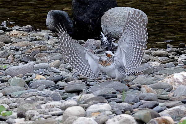 2021年 (秋 21) (第一幕) 今日は、前回と同じ渓流へ。すると、この秋に初めて見る♂がやってきた。前回いた♂は、胸の茶色が小さくて、この♂とは違う(参照:最下欄)。 新たな♂は、正面からまっすぐカメラに向かってくる。そして、小石を敷き詰めたような川原に下りた。 川原に下りるのは、珍しいこと。??と、思って視野を広げると、すぐ近くに♀の姿。 あとで気づいたが、この♂は①の場面で近くに来た♀に心を奪われ、黒い石に止まるタイミングを逸してしまった。 そのために黒い石を通りすぎてしまい、再び羽を丸く広げてブレーキをかけ、川原へ下りたのであろう。 だとすれば、「久米仙人」のようで、まだ、まだ、修行が足りないのかも ^^♪♪。 (第二幕へ続く) |