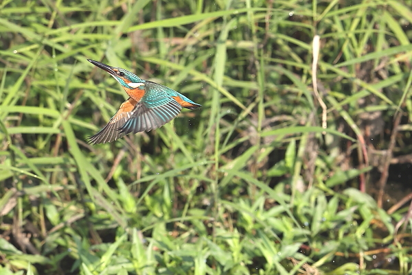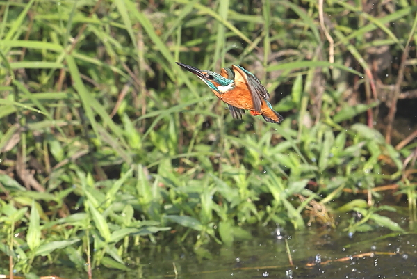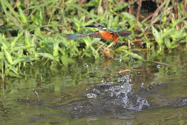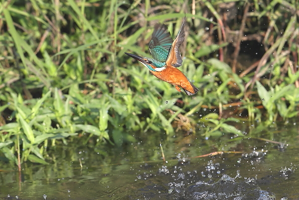 カワセミが、魚をめがけて飛び込んだ。しかし、狩りに失敗。この♂は失敗しても、またやってきては飛び込む。狙われる魚も機敏にかわすようで、狩りは失敗続き。