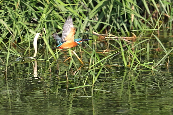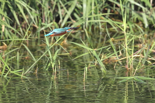 ♂が飛び込んだ。しかし、水中から飛び出す瞬間は、ピント合わせに失敗。ピントが合ったのは、数コマあとの飛び去る姿。~残念。