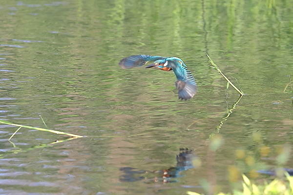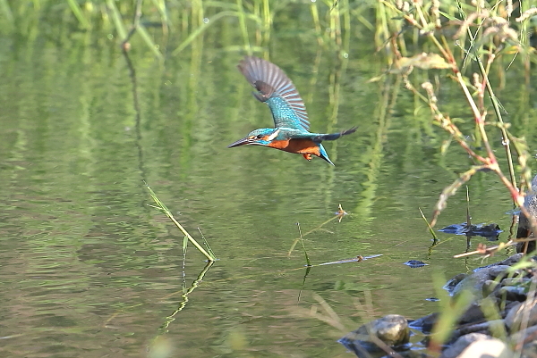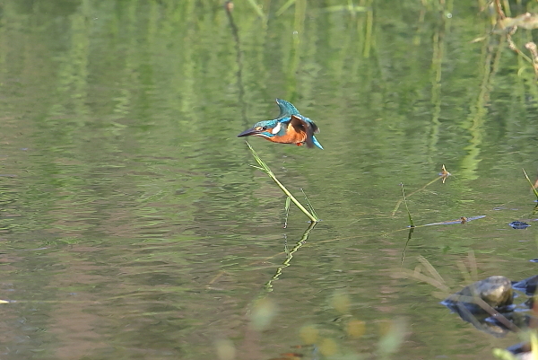 を、♂が飛ぶ。期待は、今日も狩り。しかし、飛び込まずに去ってしまった。ここに通っていれば、そのうちに魚をくわえるのでは。と、思っているが、狩り場は別の所かも、???。