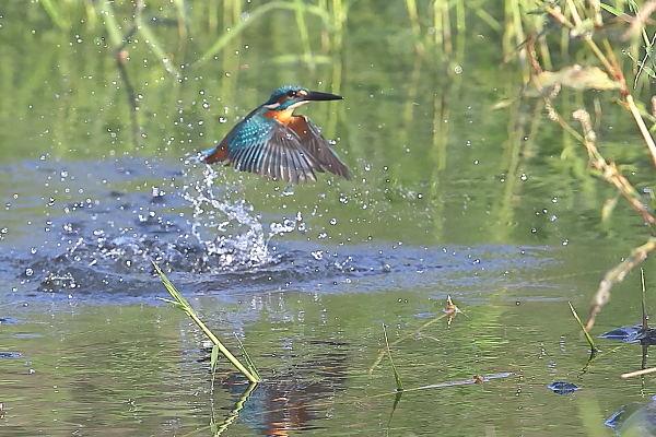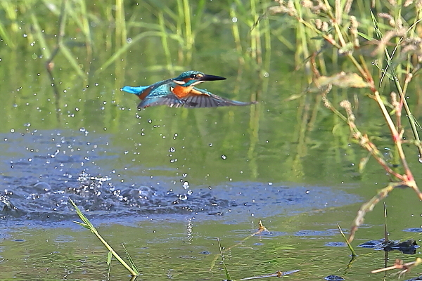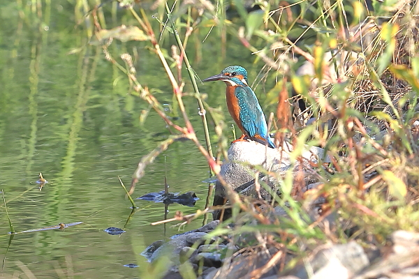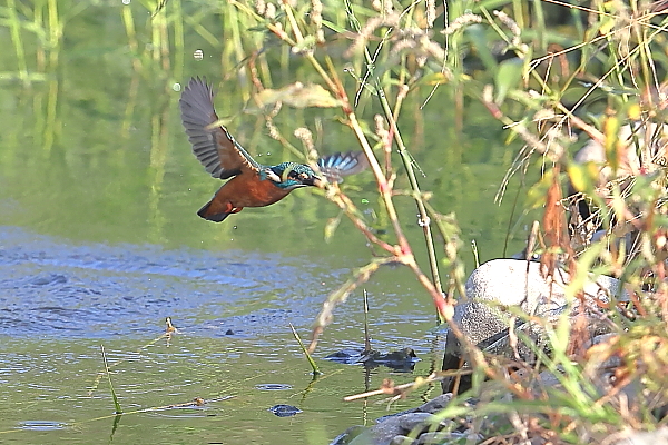2023年 (秋 5 ) 期待は今回も狩りである。しばらくすると、カワセミは水面すれすれに飛んできて、草陰の小石に止まった。レンズ越しには草に隠れることなく、どうにか全身を見ることができる。 一瞬のカメラ操作に集中して、シャッターチャンスを窺う。すると、真上にジャンプして飛び込んだ。狩りか! と、思ったら残念。水浴びであった。^^;; |