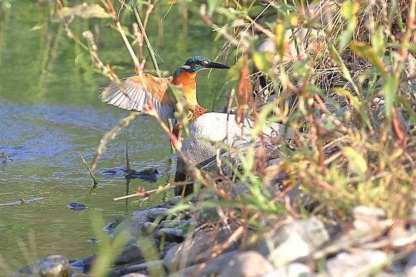 ①タデが茂る間に止まった ②一旦上に飛び上がり ③真っ逆さまに水中へ ④間髪を入れず、飛び出した ⑤翼を広げて引き返す ⑥元の小石へ・・・ ⑦大きく羽ばたいて 目は葉っぱの間に見えます これは狙ったのではなく、偶然でした^^;; ⑧両足をそろえ、元の小石に復帰です |