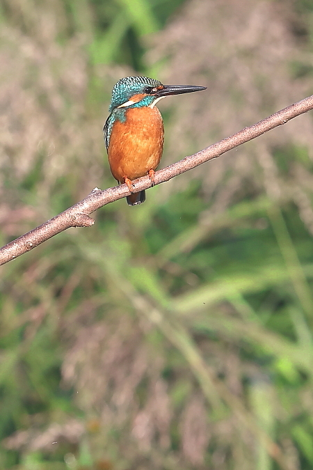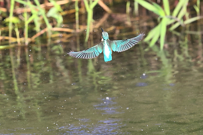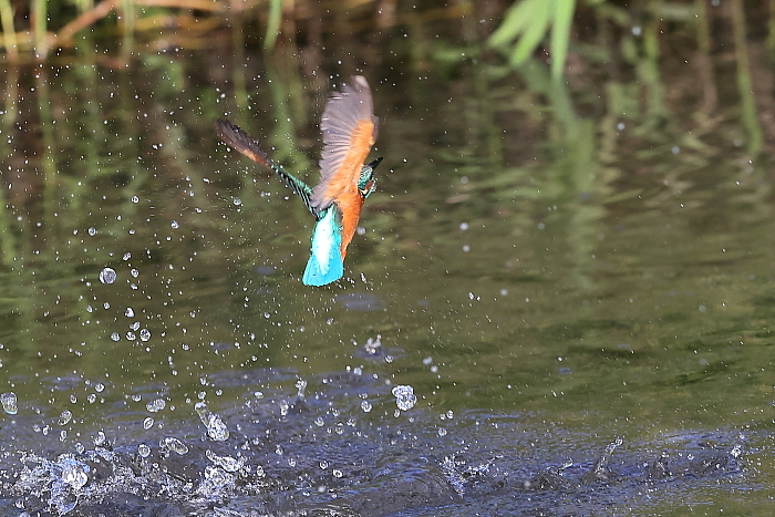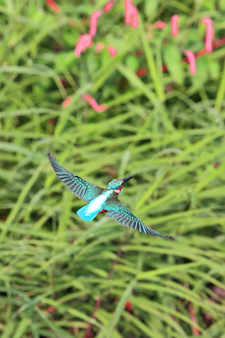 ♂が対岸にやってきた。そして飛び込んだ。ところが向こう向き。くちばしに魚はなく、狩りに失敗。しかし、タデの赤い花のそばを通過して、結果オーライとしよう。
