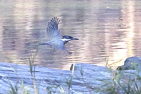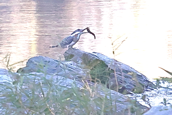 ふと気づけば、遠くの岩でヤマセミが魚を食べている。あわててカメラを向けるが、