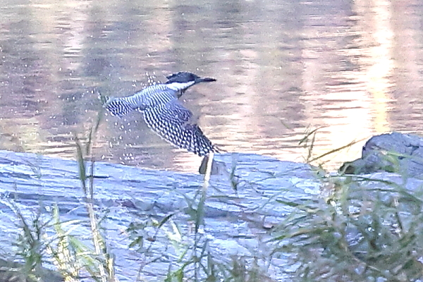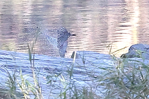 に朝日が映える逆光の中。ヤマセミは食べ終わると、体を清潔に保つためにルーティンの水浴びをして去っていった。