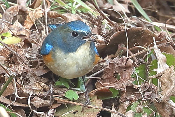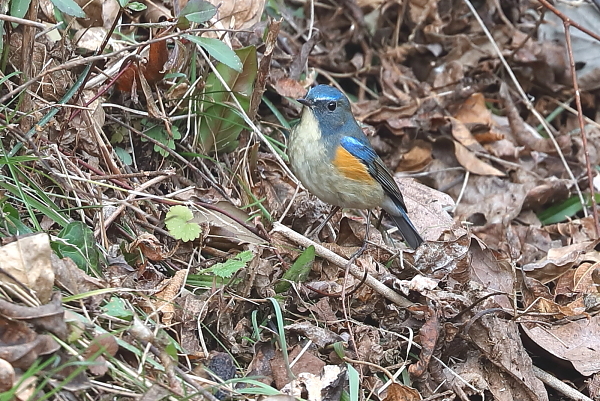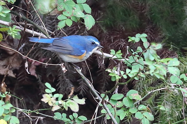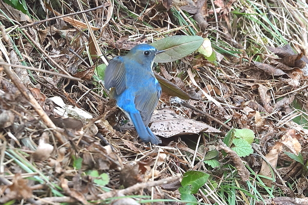 2024~25年 (冬 21) ルリビタキが野バラの蔓に止まった。そして、あたりを見回して安全を確認。その後、地面に下りてエサを探す。しばらくすると、木の実をくわえてすぐに呑み込んだ。 今日はその後、イノシシと出会った。一瞬身構えたが、距離は20mほど。これ以上近づかないように声を発すると、こちらを威嚇することもなくゆっくりと藪の中へ去っていった。 |