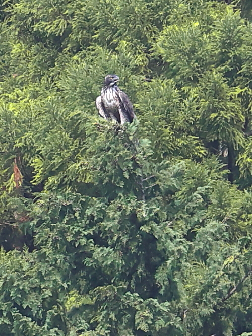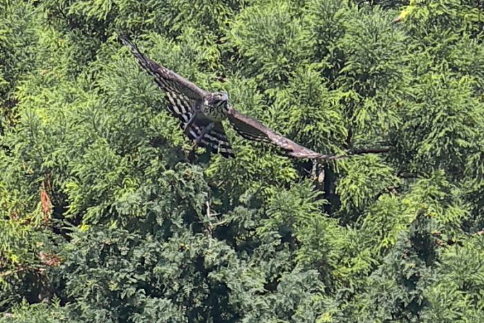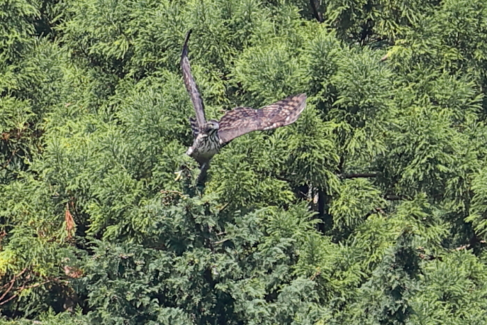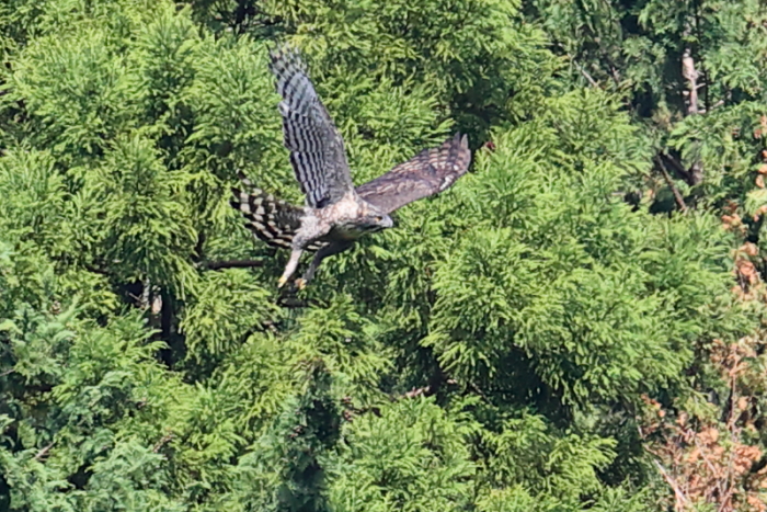 奥深い山地でクマタカを探す。双眼鏡で広く見渡していると、遠くに止まる姿を見つけた。急いでカメラを構え、飛び立つ瞬間を待つ。レンズ越しに眺めていると、クマタカは顔を左右に振りながら鋭い視線を送っているようだ。しばらくして、体を少し沈めたと思った次の瞬間、勢いよく飛び立った。