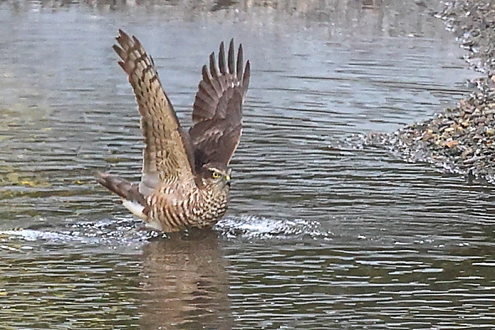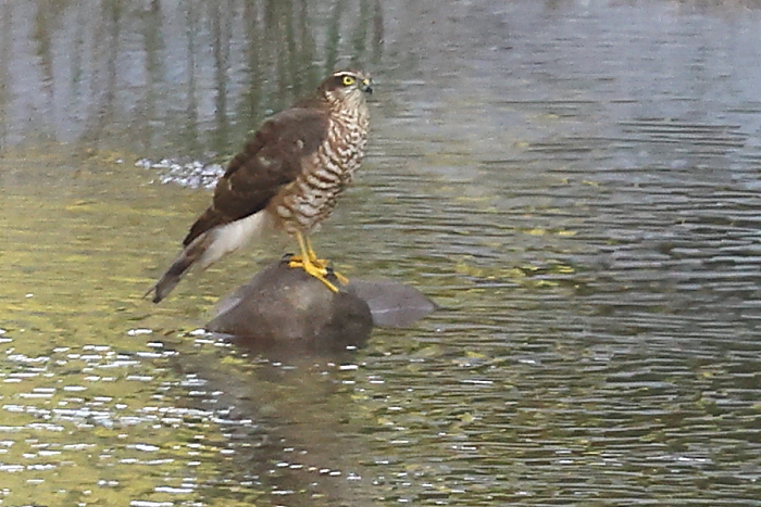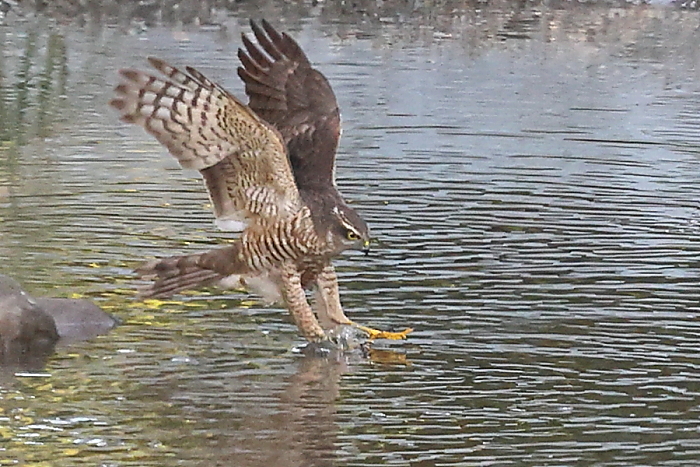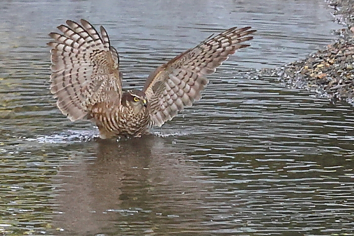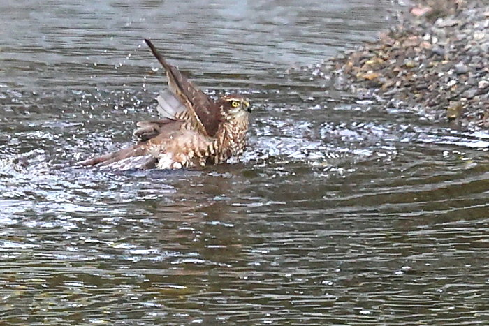 ヤマセミを期待して渓流へ出かけてみた。ヤマセミを待っていると、近くの山から何やら舞い降りた。キジバトかな、と思ってカメラを向ける。すると、ハイタカである。石に止まったハイタカは辺りを見回して安全を確認した後、ゆっくりと水浴びをして飛び立った。