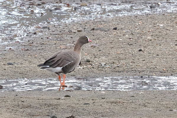 2024~25年 (冬 9) クロツラヘラサギが冬を過ごしている溜め池に出かけてみた。池には20羽ほどが羽を休め、しばらくすると数羽が上空にやってきた。そして、旋回しながら仲間のところに降り立った。周辺にはカモの類もいて、それらを双眼鏡で眺める。すると、一羽のカリガネを見つけた。このカリガネは仲間とはぐれて、ここへやってきたのであろう。 |