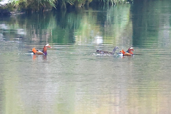 ここはヤマセミの棲む渓流である。ヤマセミを待っていると、上流の波静かな深場にオシドリ三羽が飛んできた。久しぶりに見るオシドリは美しいと思う。これからはヤマセミに加え、オシドリの飛来も楽しみにしたい。