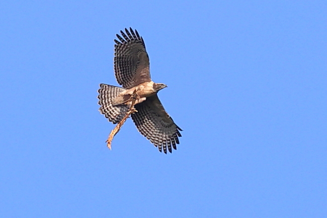2024年 (秋 4) 青空高く、クマタカが巣材を掴んでやってきた。そして、旋回をしながら尾根の向こうへ消えた。クマタカは巣の補修をしながら、長年にわたって巣を維持するという。この若いクマタカは繁殖に向けて、巣の手入れをしているのであろう。 と思っていたら、すぐに山肌に沿ってやってきた。この一連の様子からすれば、若いタカは親から生きる術を学びながら、枝運びのまねをして遊んでいるのかも知れない。^^;; |