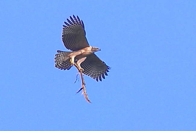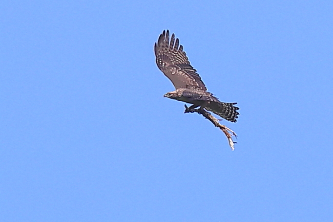 ① 巣材の枝を掴んでやってきた ② 上空を旋回 ③ 両足で掴むのは、巣材を運ぶ時の一般的な姿 しかし、経験豊かな成鳥にくらべ、何となくぎこちないようにも見える ④ 少しして、またやってきた |