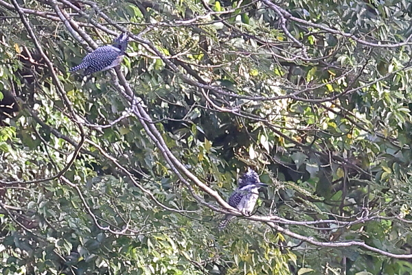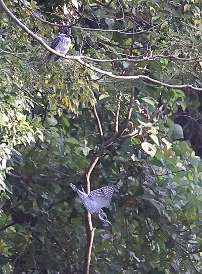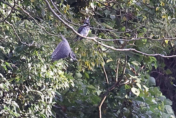2024年 (秋 6) 以前の観察地へ出かけてみた。ここは数年前からヤマセミが見られなくなったところで、今回は様子見である。 現地に着いてしばらくすると、懐かしい声とともに♂がやってきた。しかし、止まったのはかなり離れたところである。警戒されないように静かに眺めていると、今度は♀がやってきて♂の近くに止まった。今日は待ちに待った、ヤマセミとの再会が叶った。^^♪ ヤマセミまでの距離はあるものの、数年ぶりの様子見にしては上出来である。次から工夫をして、ヤマセミが近づくのを待ってみたい。 |