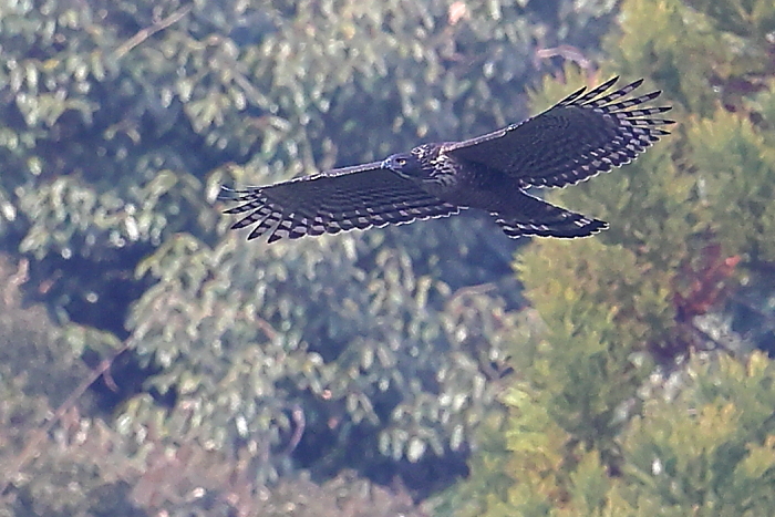 クマタカは、遠くの樹林の陰からふわっと現れた。そして、谷の上を横切るように近づいてきた。