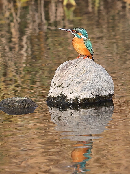 み、カワセミは早い時刻にやってきた。期待はホバリング。フォ-カスリングに指を添えて、その瞬間を待つ。しかし、飛び上がることなく、水面を飛び去ってしまった。