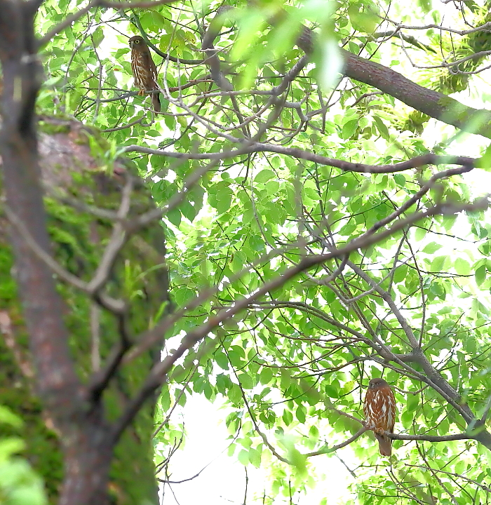 2024年 (夏 9) 前回は縞模様の状態などがよく見えず、雌雄の区別ができなかった。それが今回は見え、下にいる体の大きい方が♀で高いところが♂のようだ。 カップルは、これから子育ての時期を迎える。彼らにストレスを与えないよう、遠くから静かに見守りたい。 |