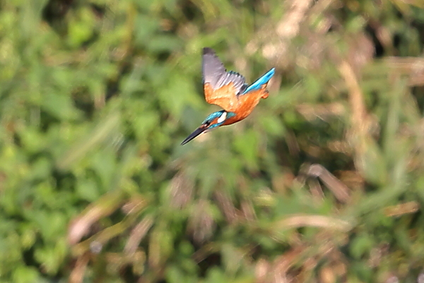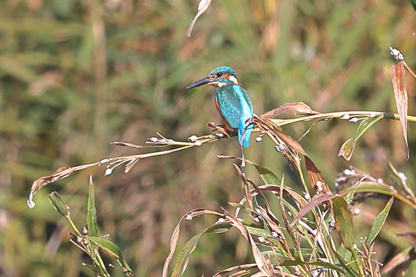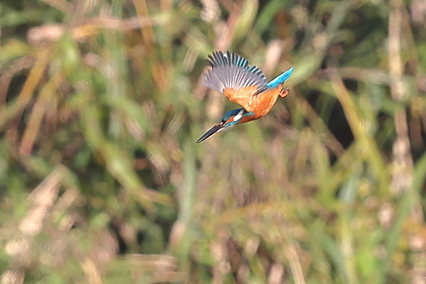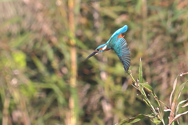 カワセミが対岸のジュズダマ(数珠玉)の茎に止まった。しかし、美しい腰の部分が葉陰に。カワセミが少し移動して、全身が見えるようになるのを待つ。ところが、そのまま魚を目がけて飛び出した。