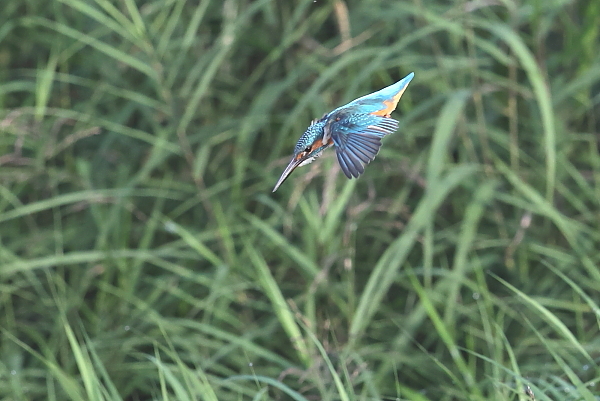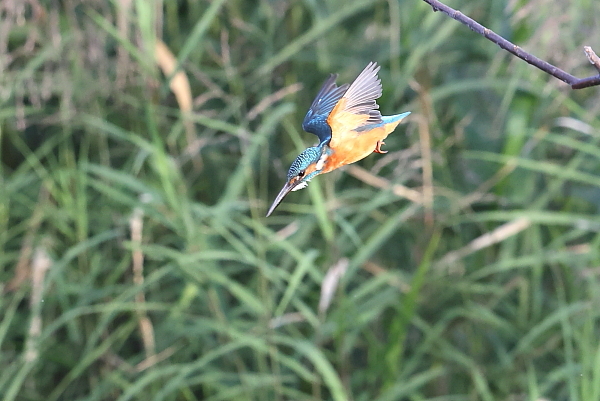 ♂がいつもの枝にやってきた。そして、水中の魚を探す。その様子を眺めていると矢のように飛び出した。と同時に、カメラで追う。しかし、その速さについて行けず、狩りの瞬間は撮影に失敗。
