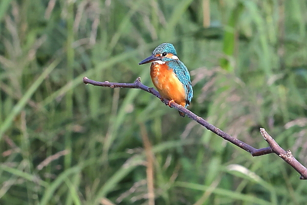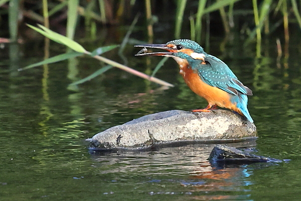 カワセミは狩りに成功して、近くの石の上へ。改めてカメラを向けると、くわえ直して一気に呑み込んだ。