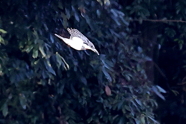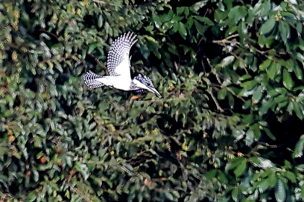 山に近い清流でカワセミを待っている時、遠くから「キャラッ」「キャラッ」とヤマセミの声がした。声がした樹林に視線を送りながら探してみる。すると、枝葉の陰に止まるヤマセミを見つけた。遠くてヤマセミの全身は見えないものの、カメラを向けるとすぐに飛び出した。
